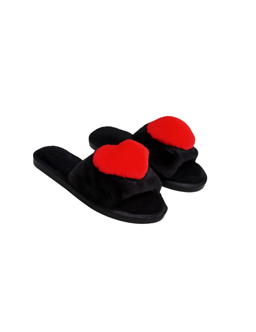 Step into comfort with a playful touch. These cozy slip-on slippers feature a plush black base topped with a bold red heart for a look that’s as fun as it is soft. Designed with cushioned soles and fluffy faux fur, they’re perfect for lounging at home while adding a little love to your downtime.