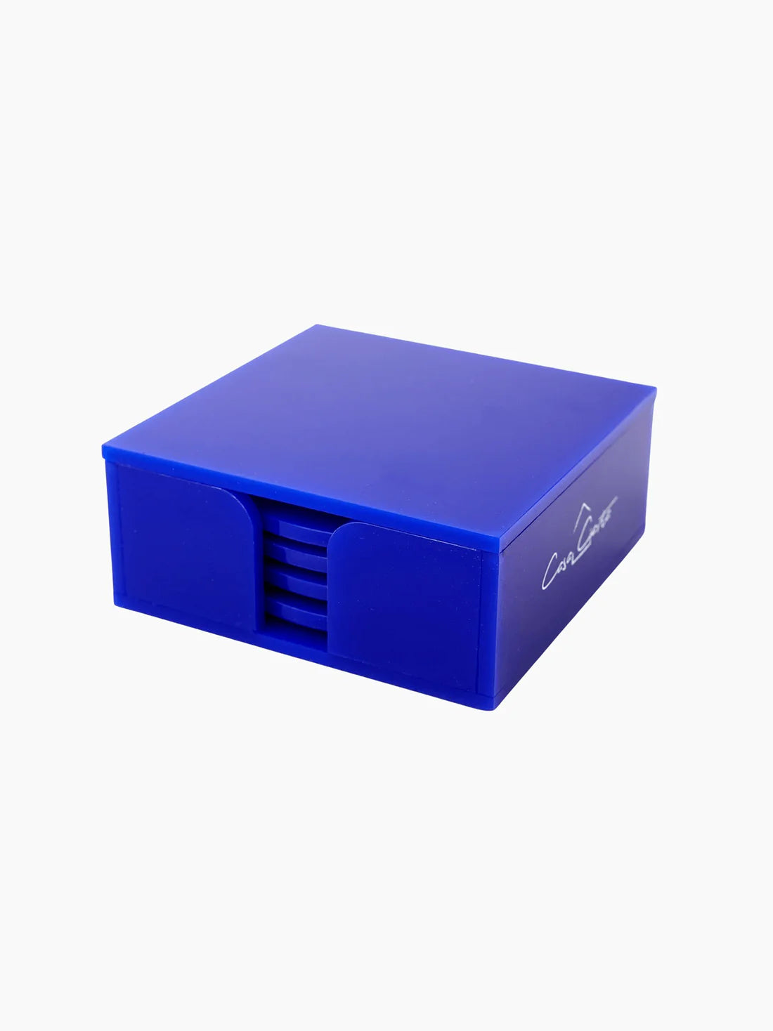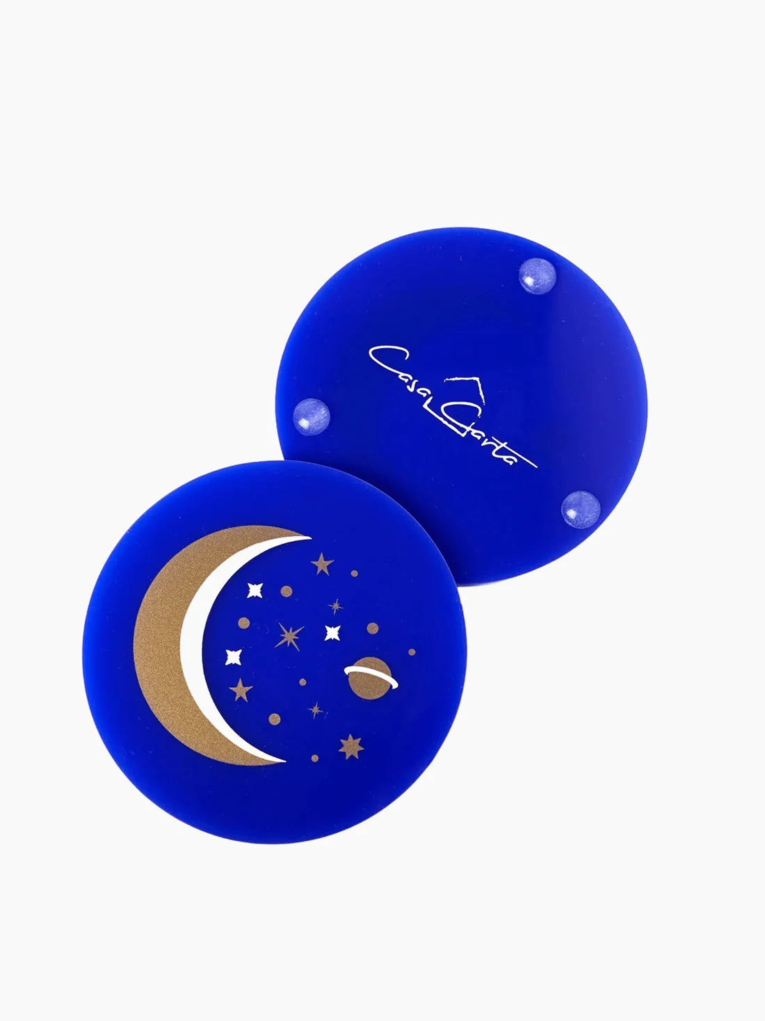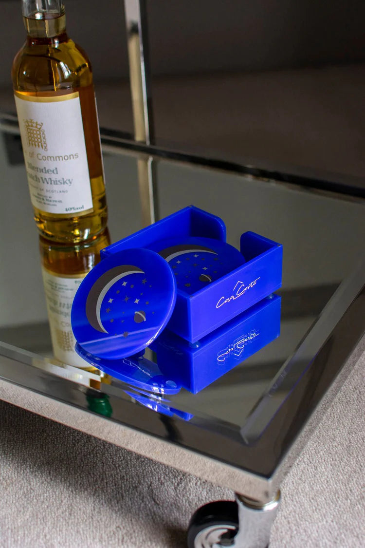 Handmade with a gold and silver galaxy-inspired finish, these navy coasters bring a playful pop to any table. They come in a matching acrylic holder that keeps things neat (and looks good doing it).
