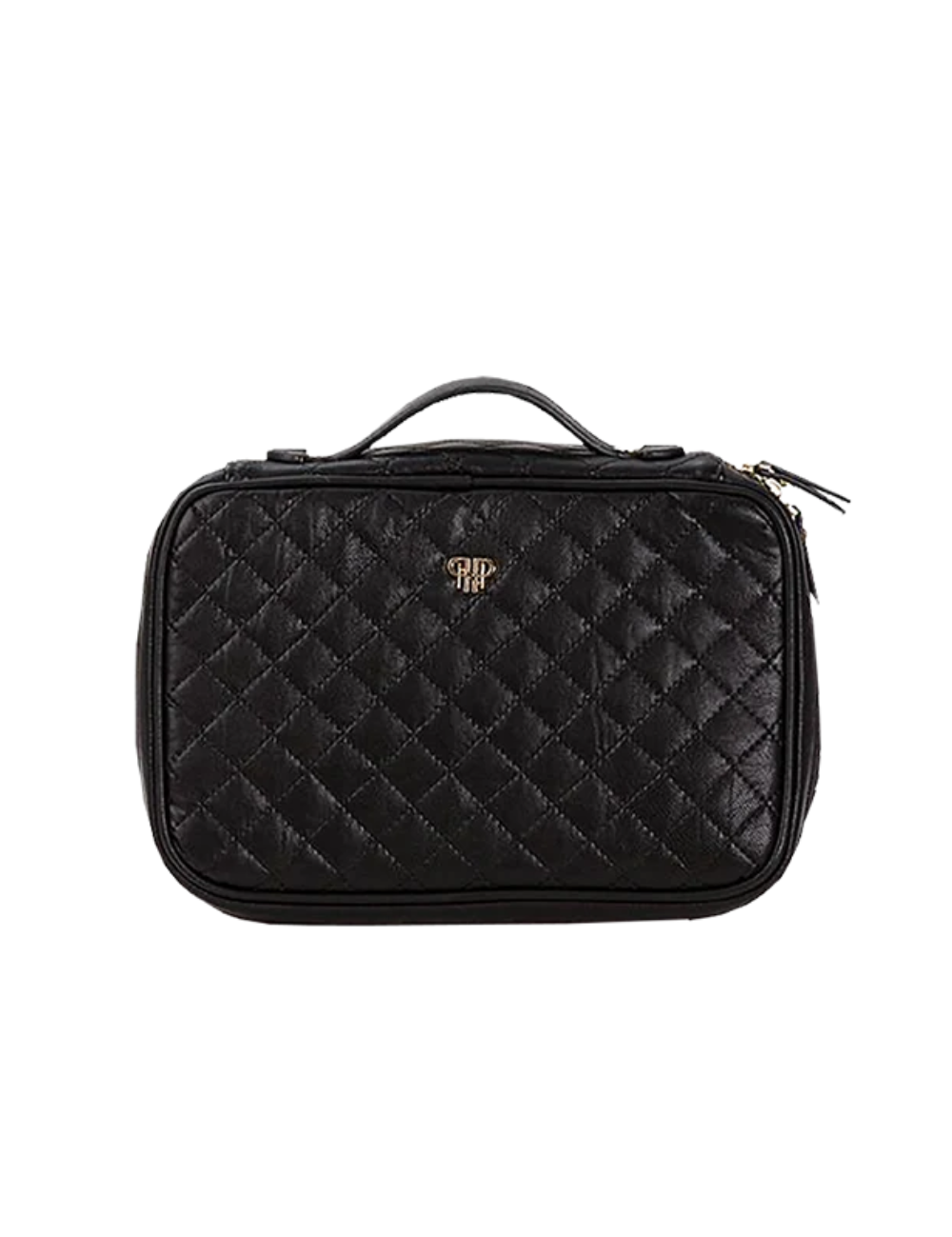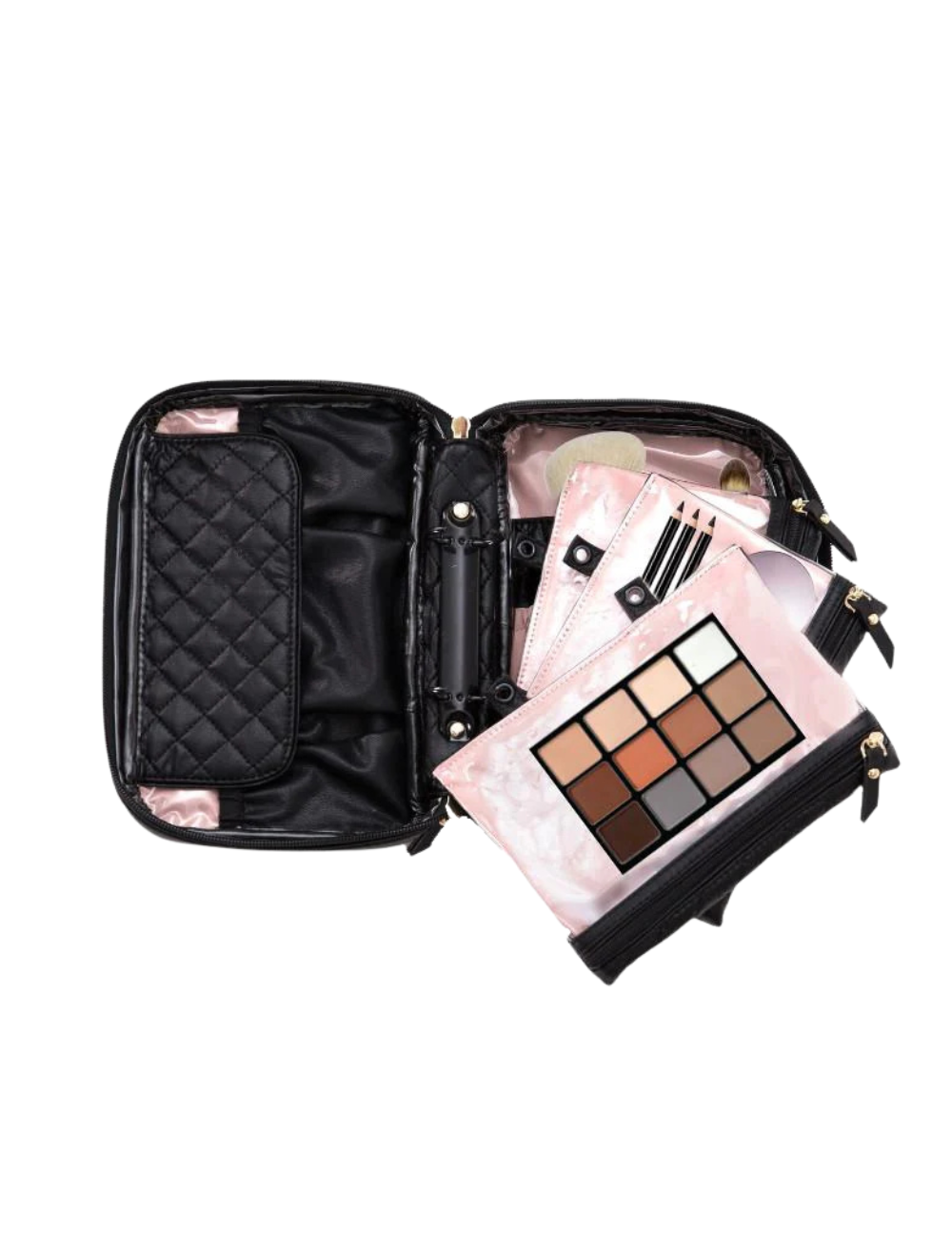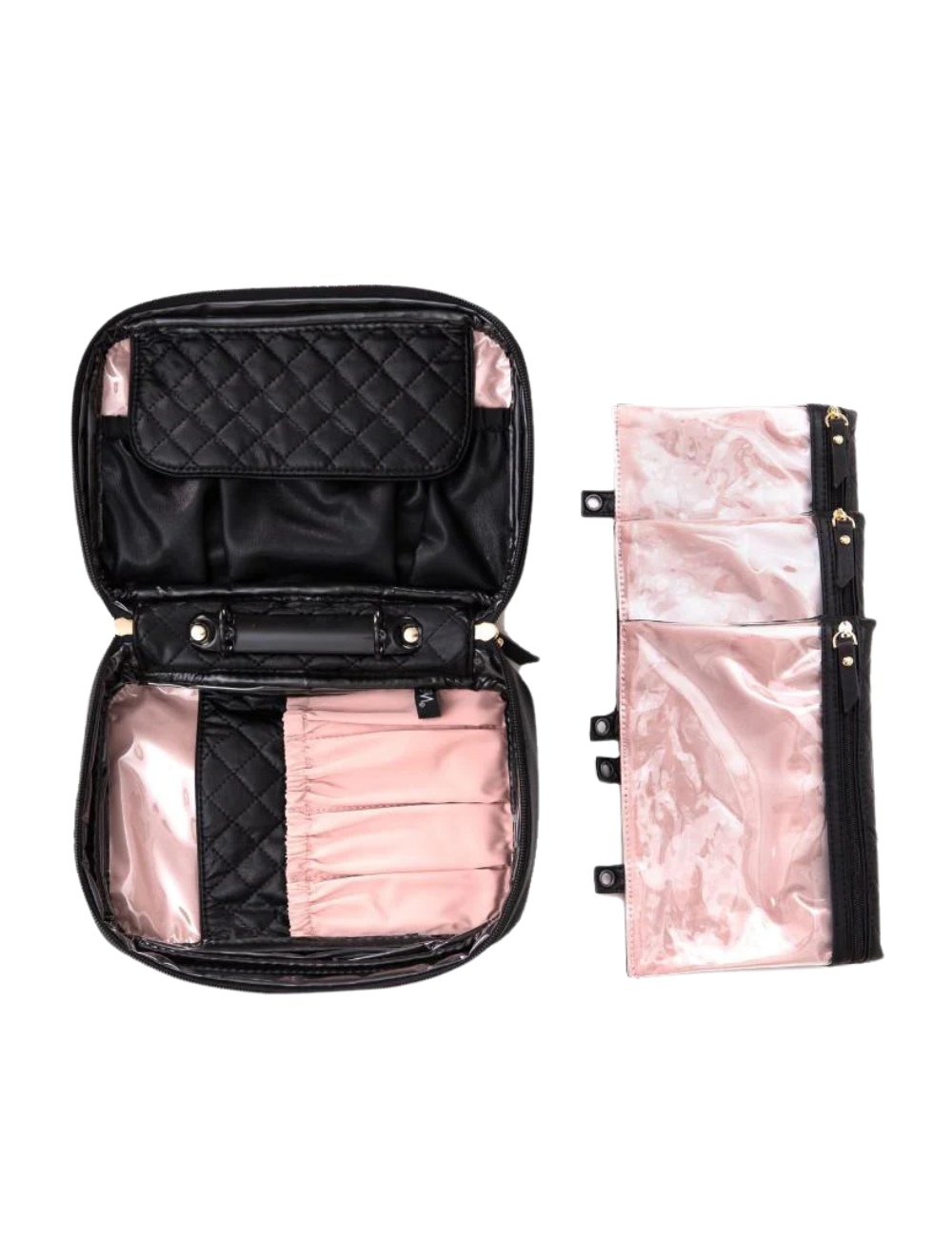 The "Chanel' inspired Timeless Quilted Lexi Travel Organizer is the perfect makeup case for organized travel. The 2 ring binder system with 3 large removable clear front pouches lets you optimize your cosmetics in a functional way. The easy to clean wipeable interior is perfect for cleaning those inevitable makeup mishaps. The front has a magnetic snap closure pouch that secures your smaller toiletries, and the back features pockets to hold brushes, bottles, and more. The expansion capability adds convenience and versatility while you’re on the go and need to carry just a bit more.